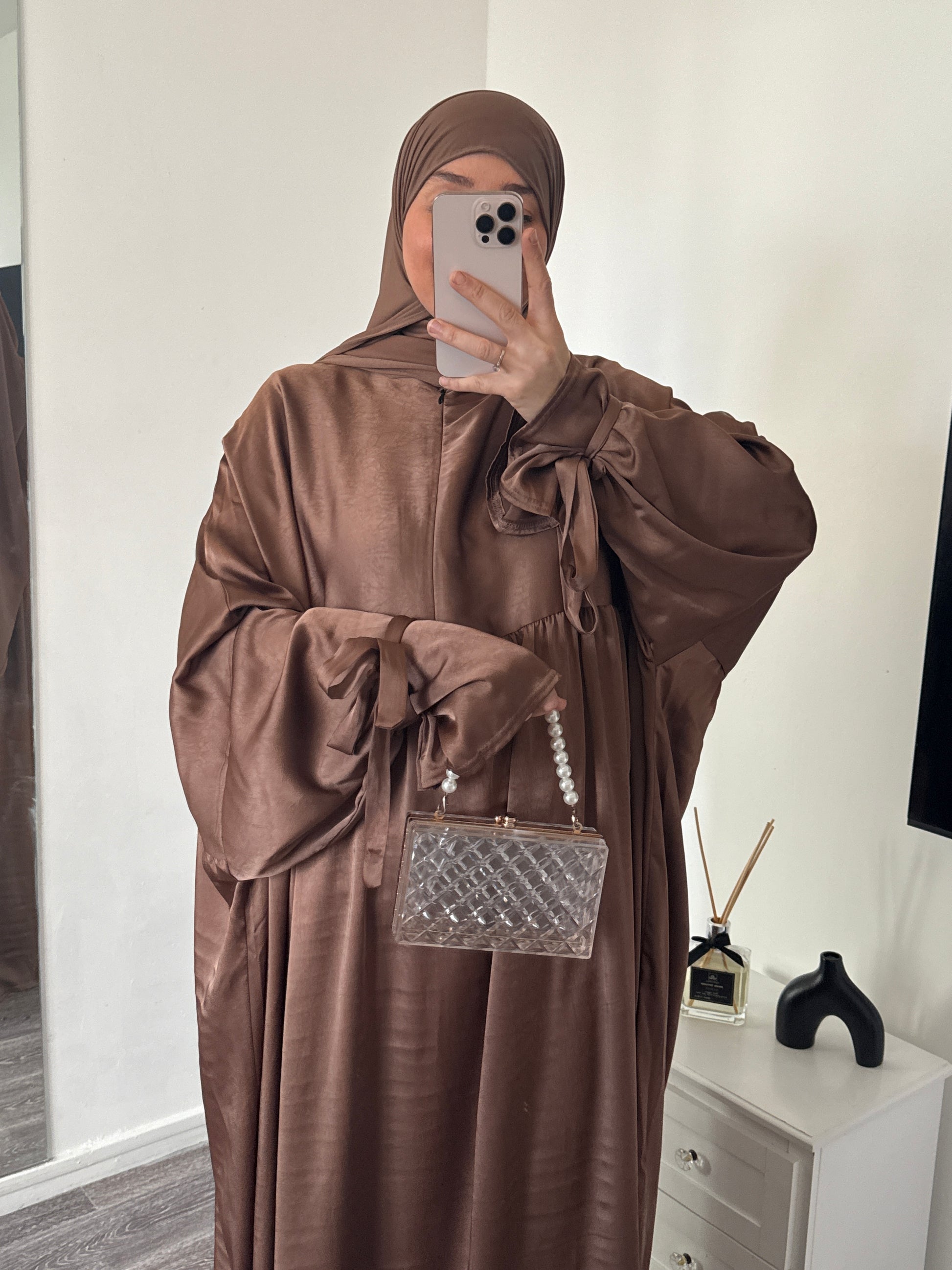 Une ouverture zippée discrète à l’avant apporte un côté pratique, sans altérer l’esthétique de l’abaya.