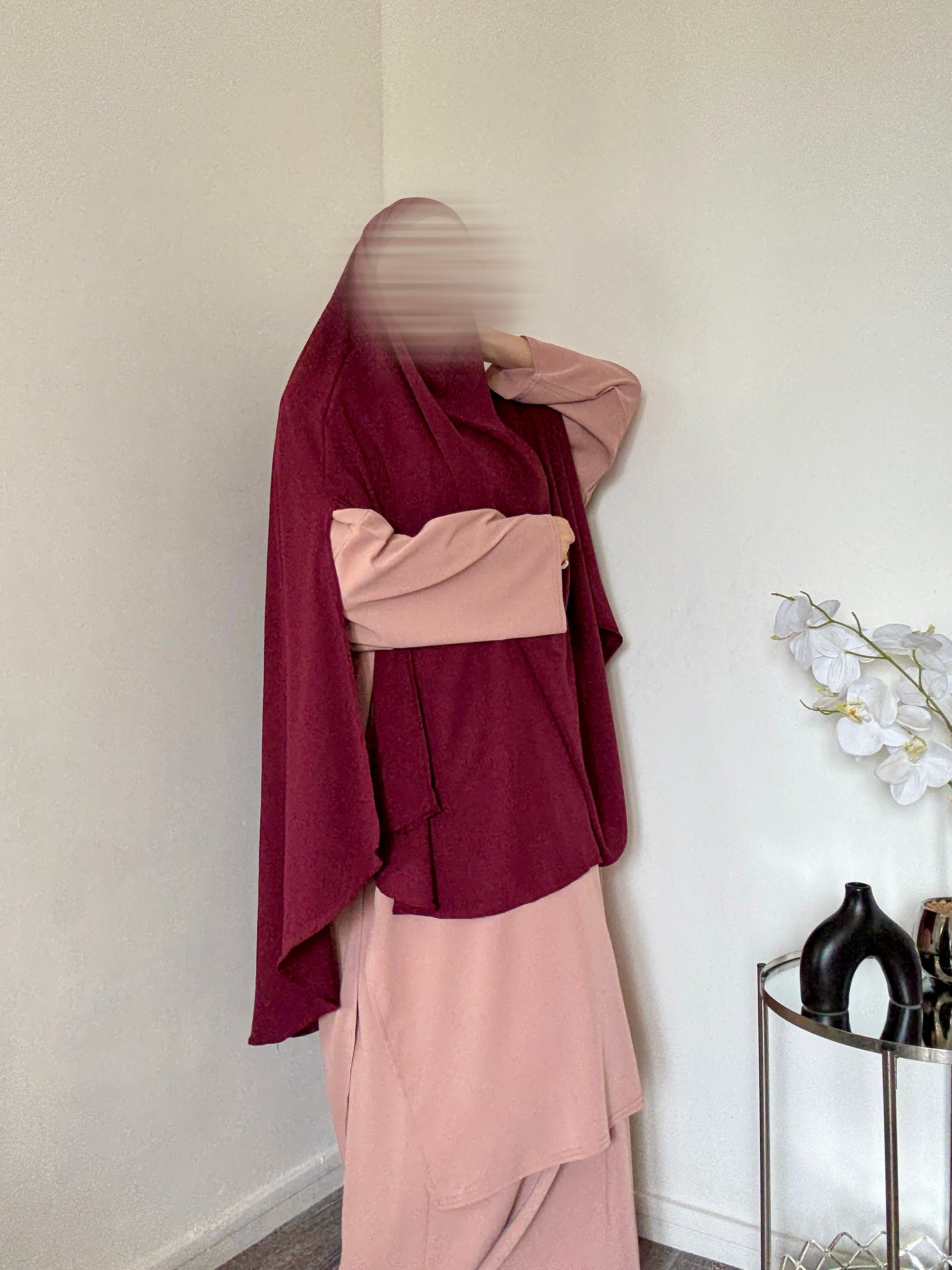 Le Khimar à fentes s'attache à l'arrière comme un jilbeb ( bonnet et cache menton intégrés).