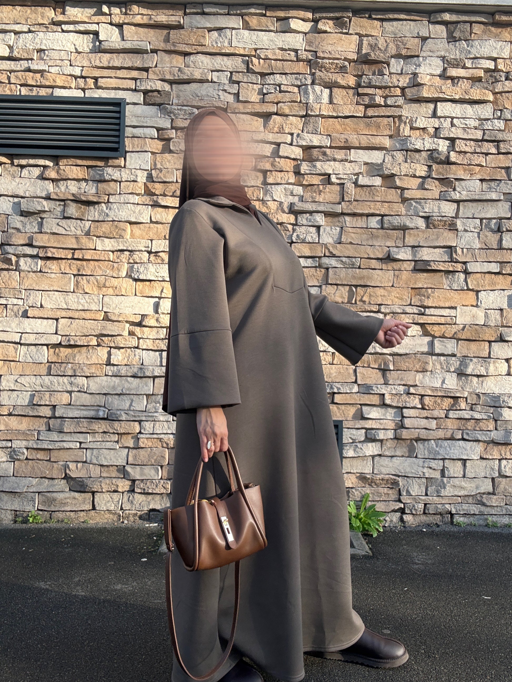 L'abaya Cosy se distingue par sa silhouette évasée, ses manches amples et son col montant, réalisée dans un tissu mi-épais idéal pour la saison.