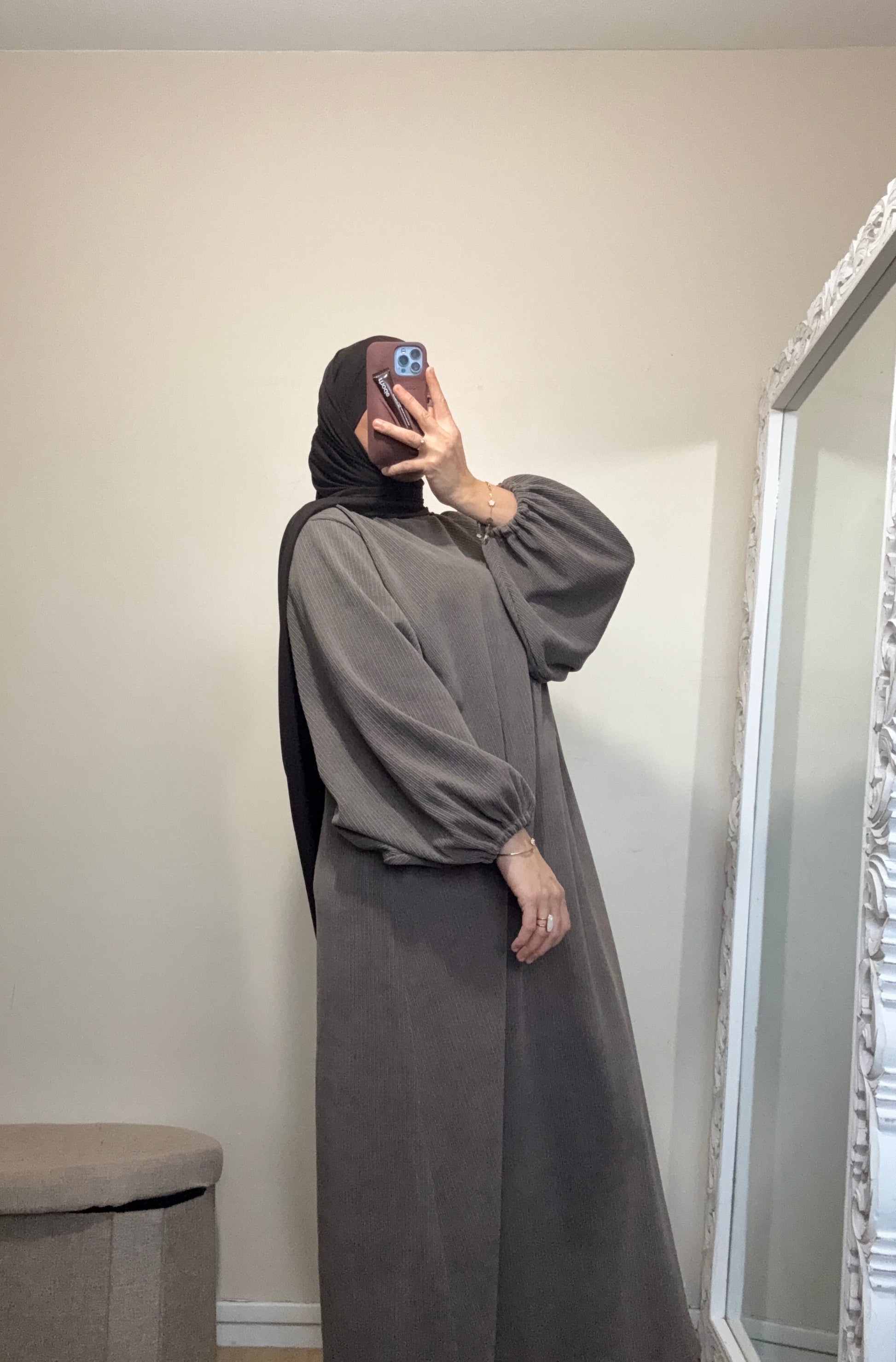La Abaya velour est une abaya coupe évasée avec des manches ballon.