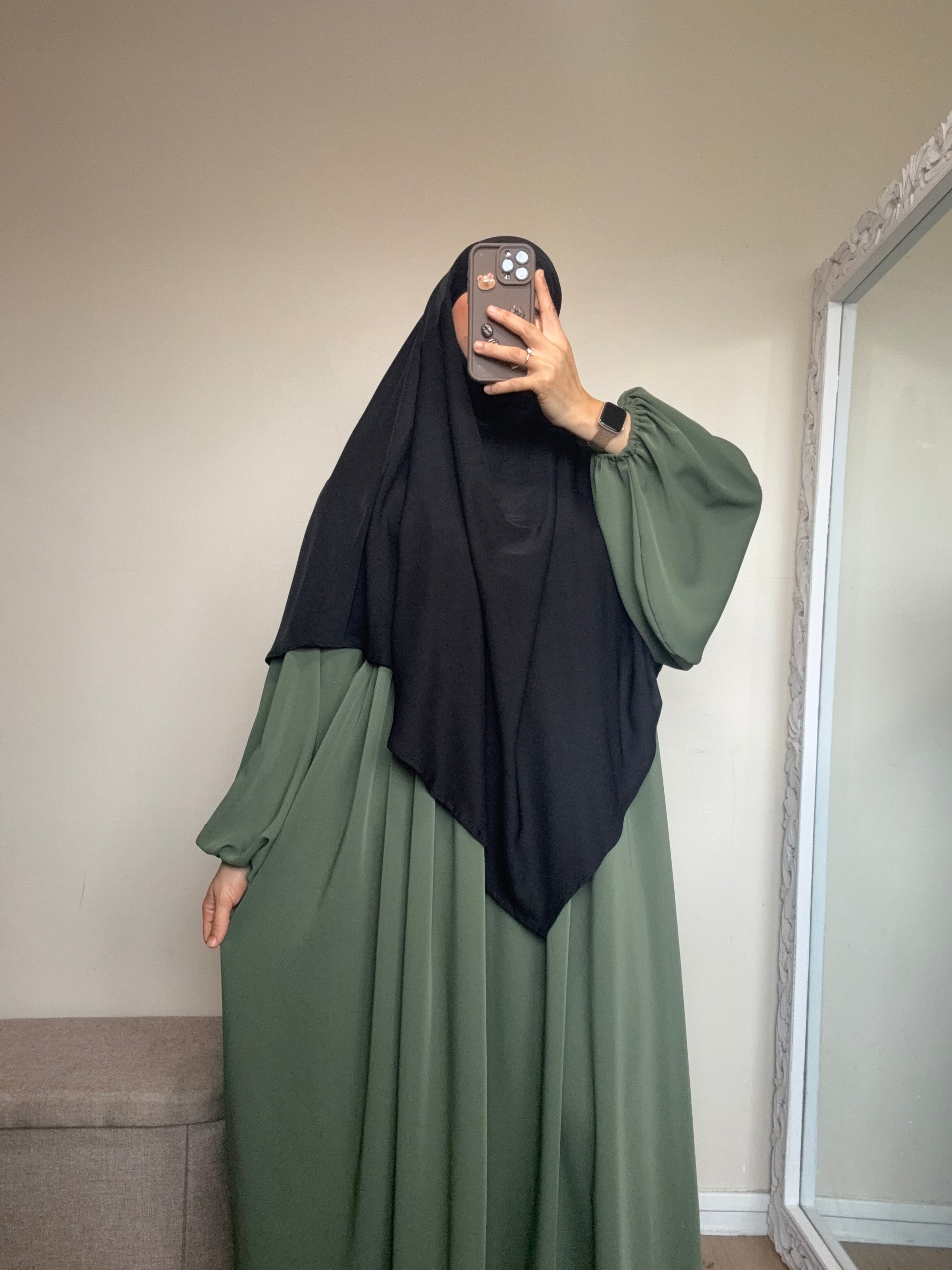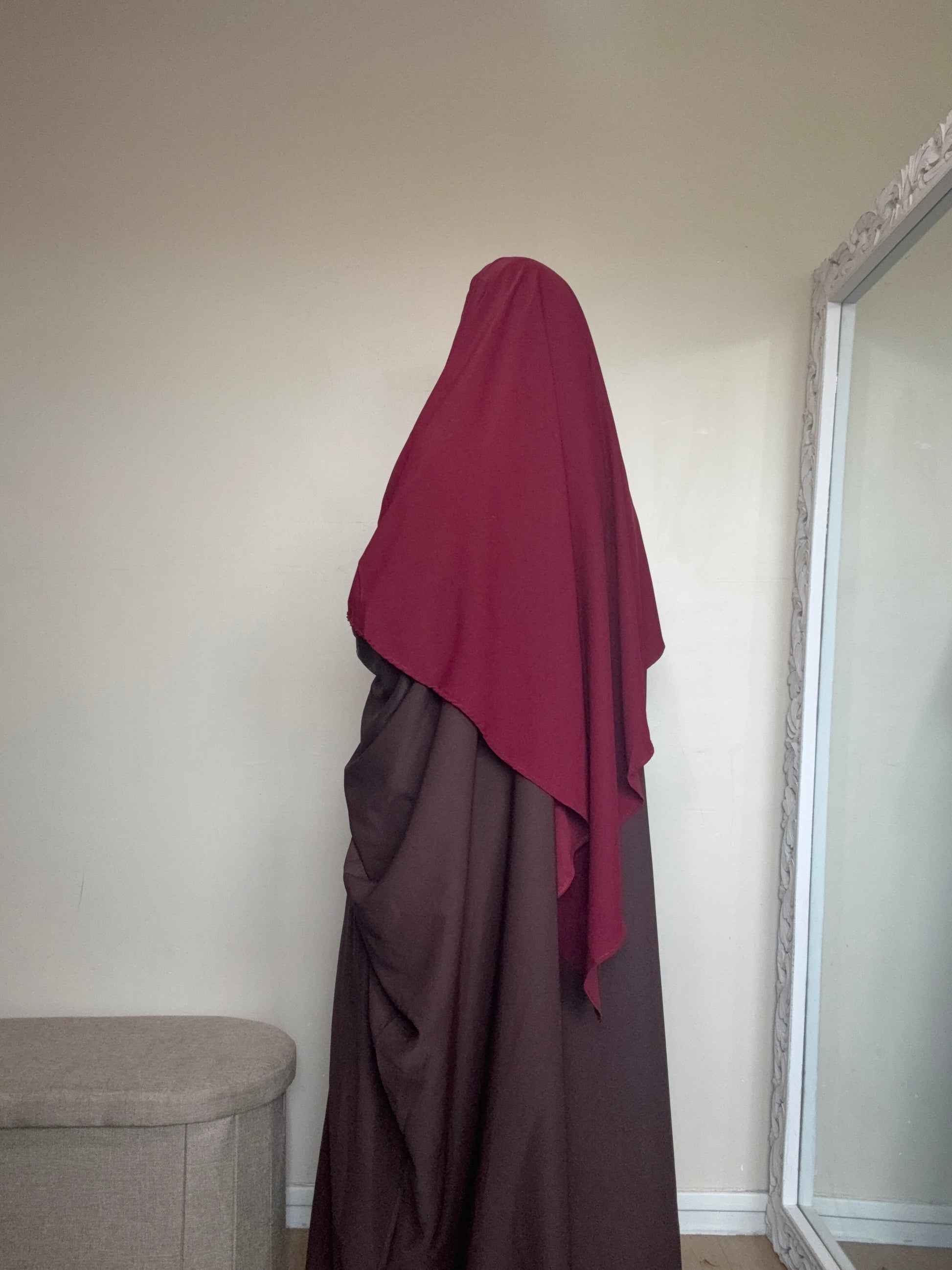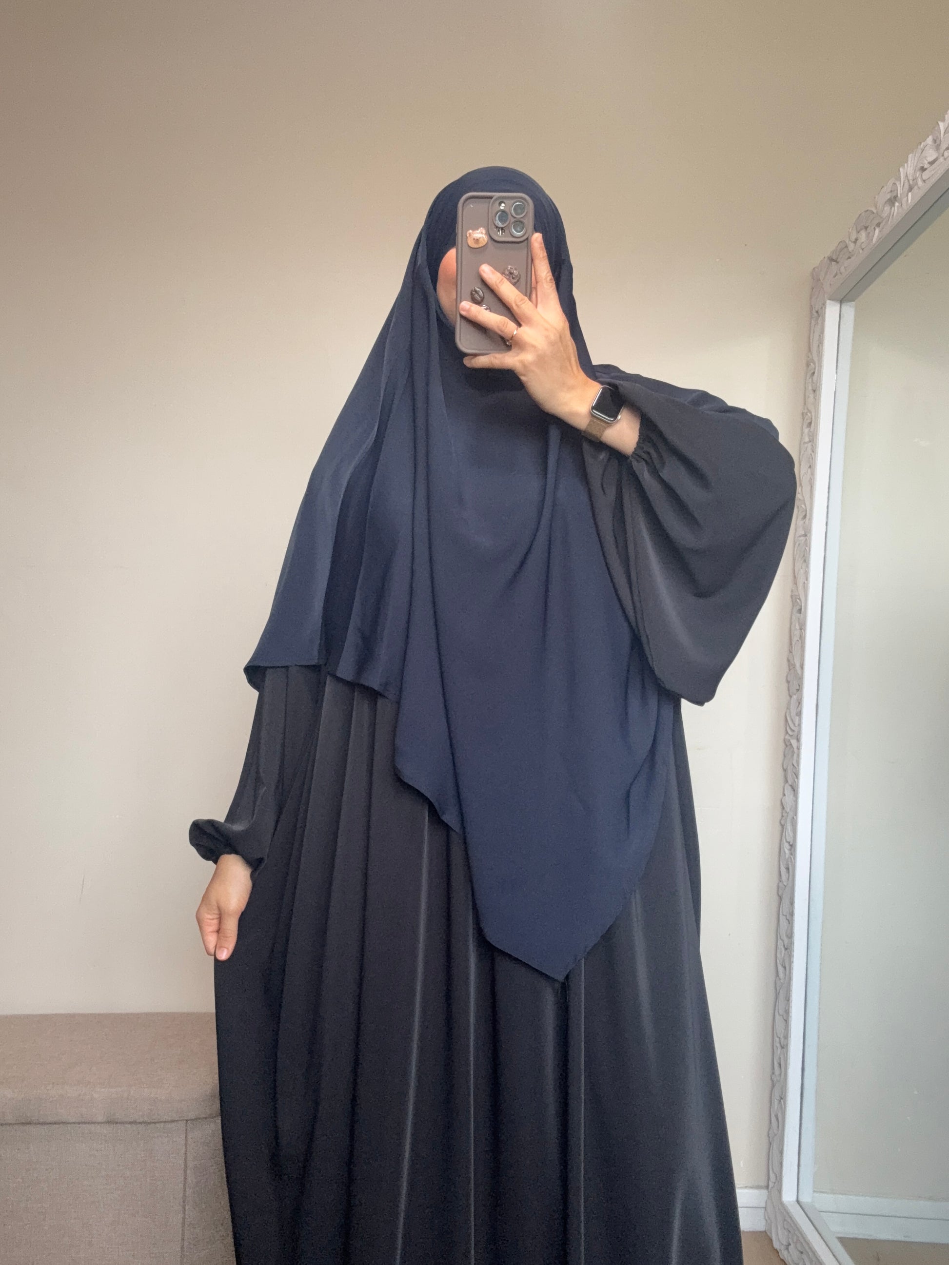 Le Khimar Médina apporte pudeur et élégance à vos tenues grâce à son tissu soie de qualité premium et sa coupe mi longue et pointue.