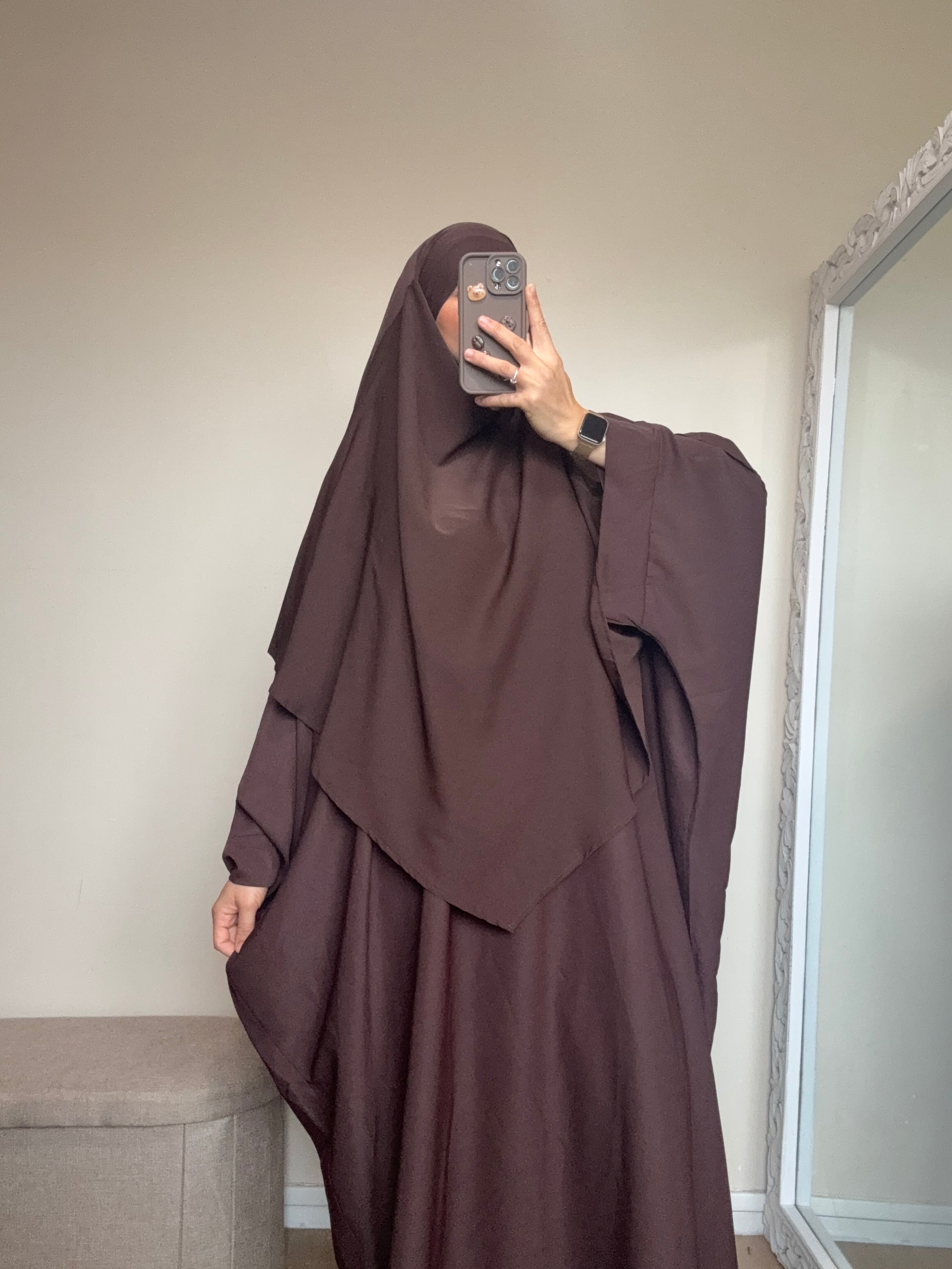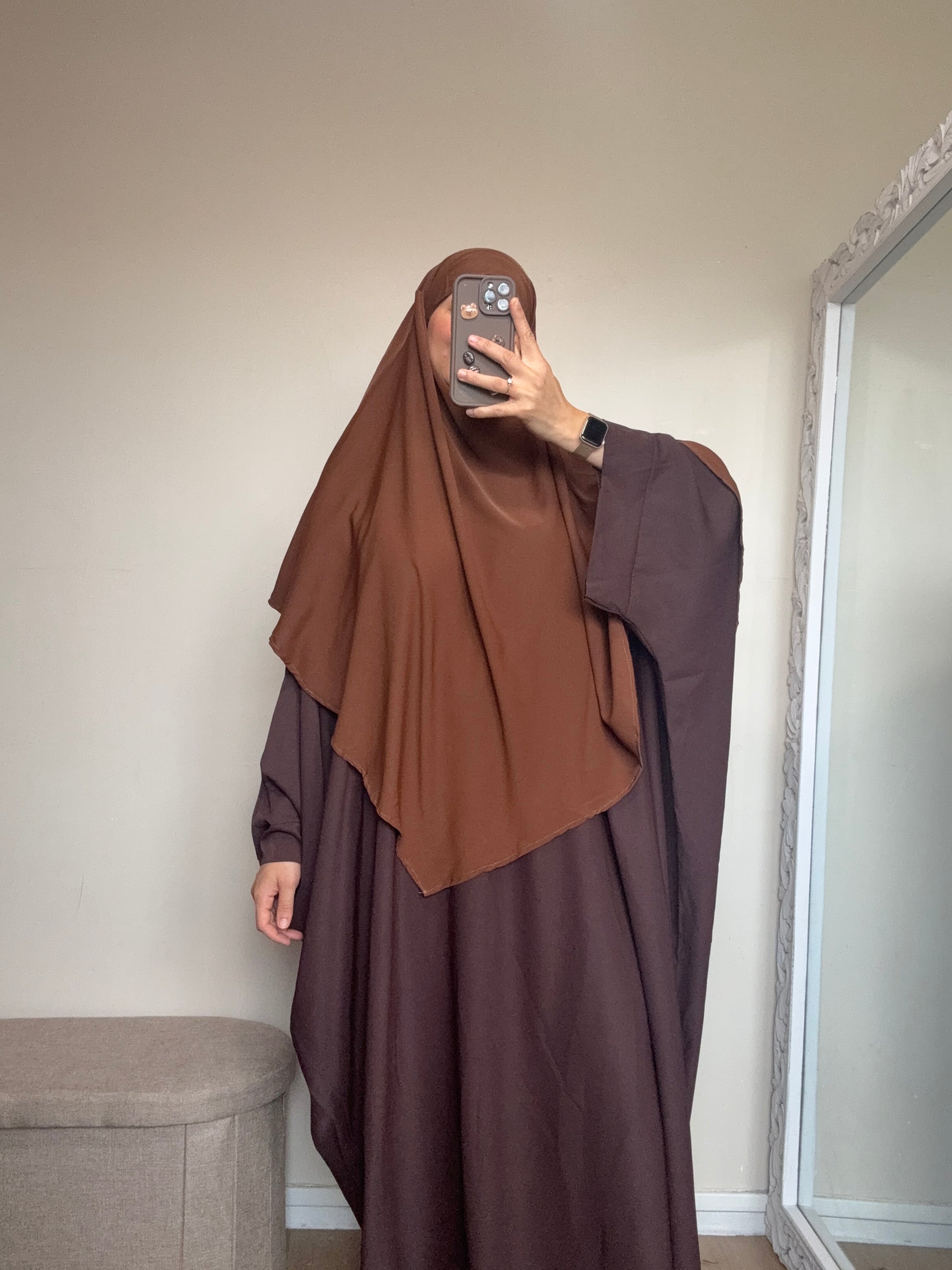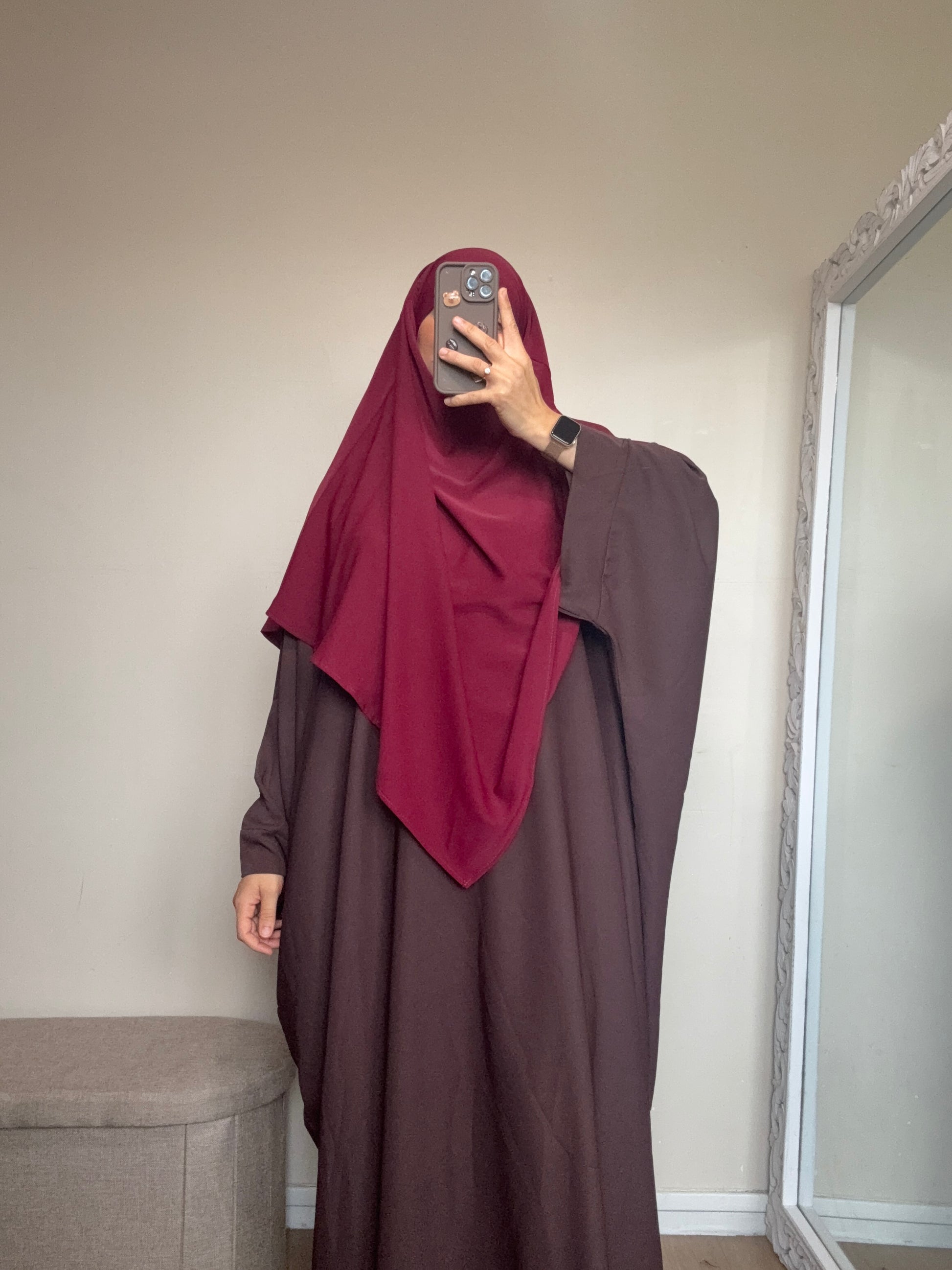 Le Khimar Médina apporte pudeur et élégance à vos tenues grâce à son tissu soie de qualité premium et sa coupe mi longue et pointue.