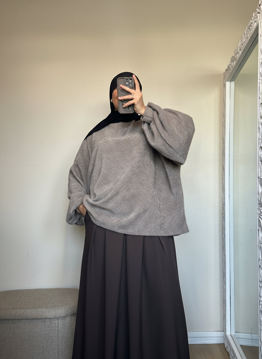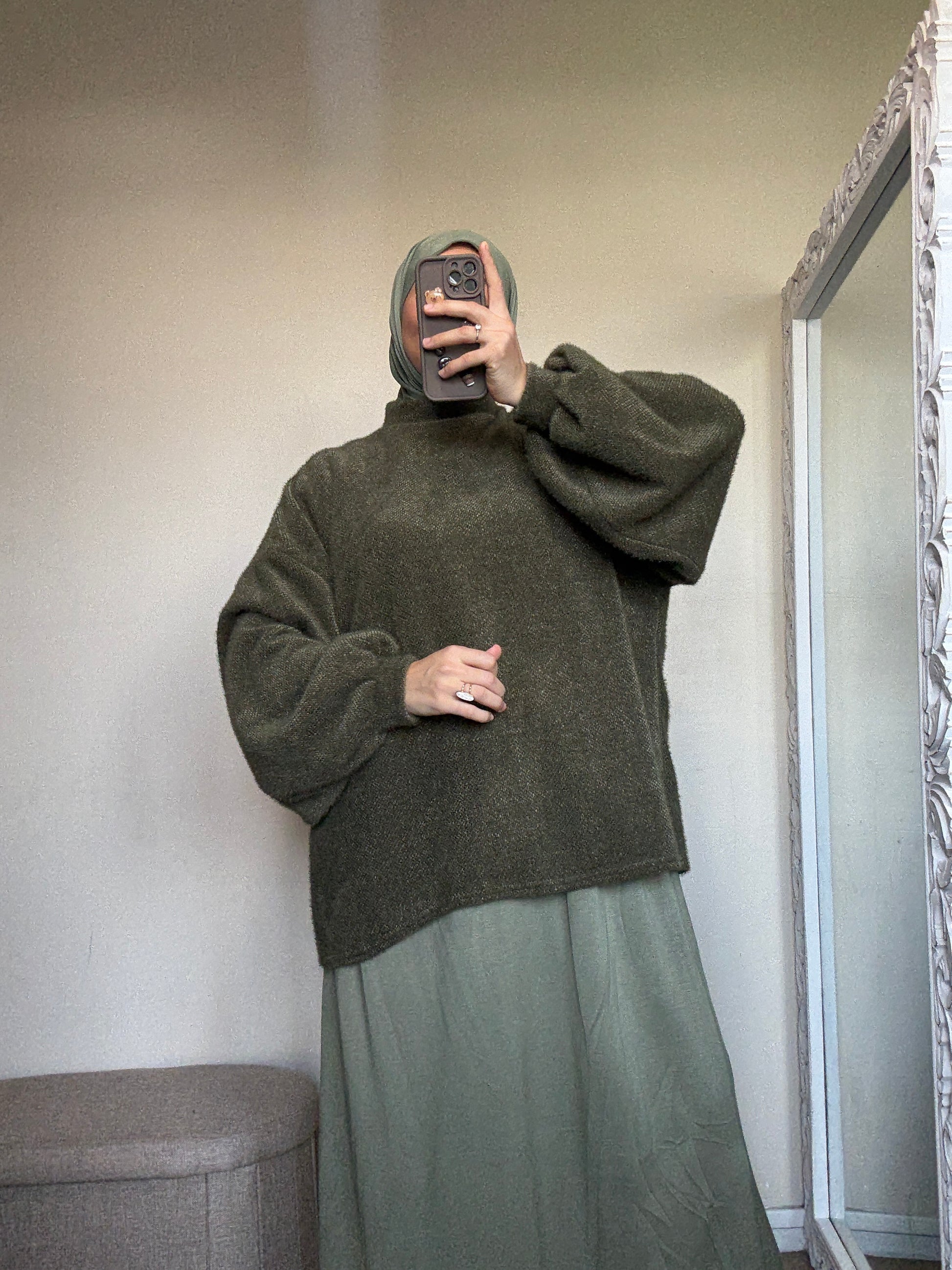 Sa matière épaisse et douce te garde bien au chaud, tandis que ses manches ballons élégantes apportent une touche féminine et tendance.